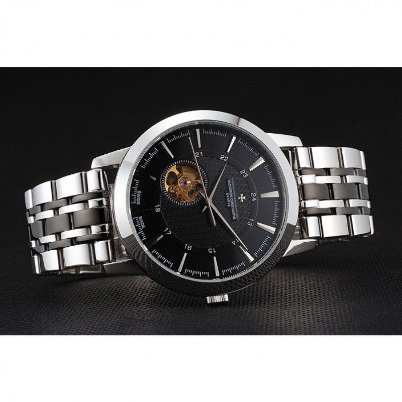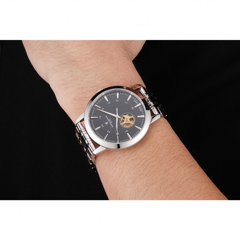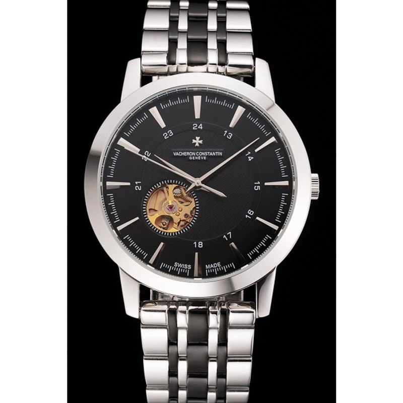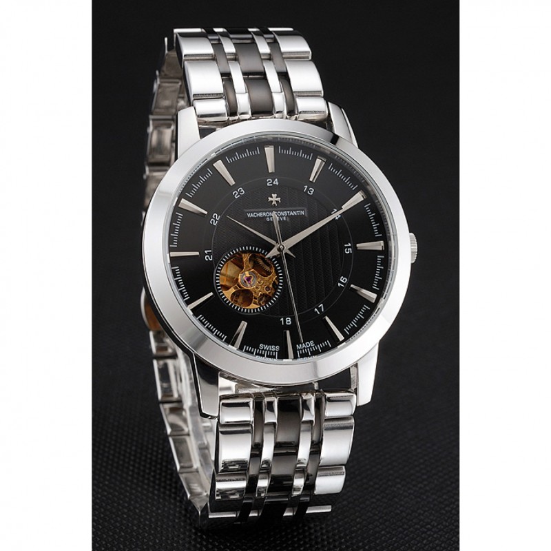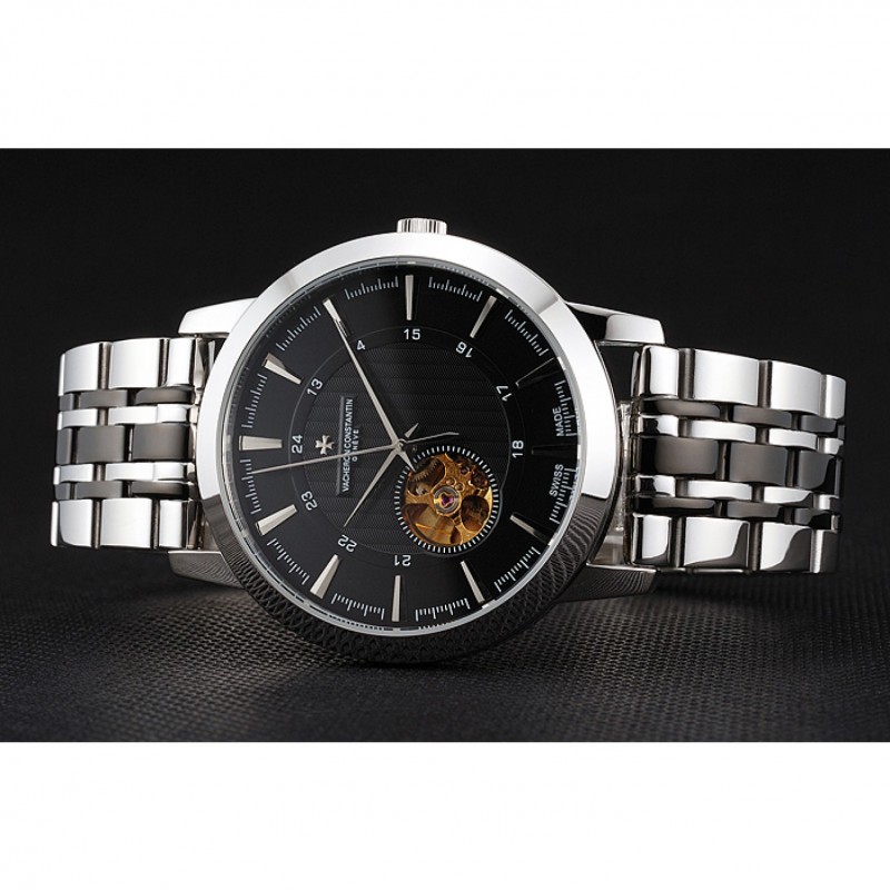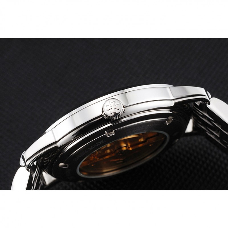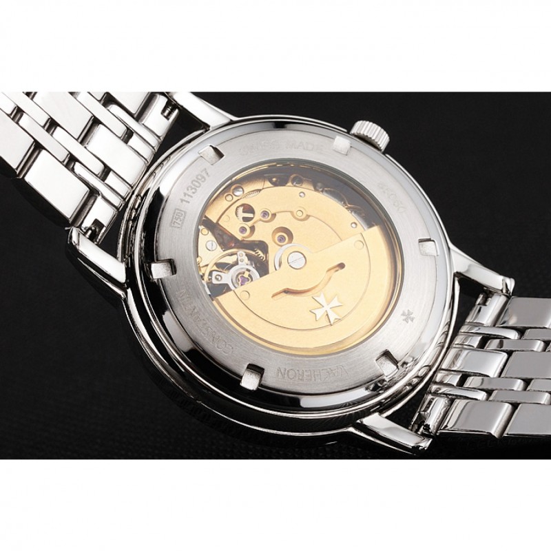 Volver: de acero inoxidable pulido complemento de vuelta con la mecánica transparentes revelando centro y Vacheron Constantin logo grabado