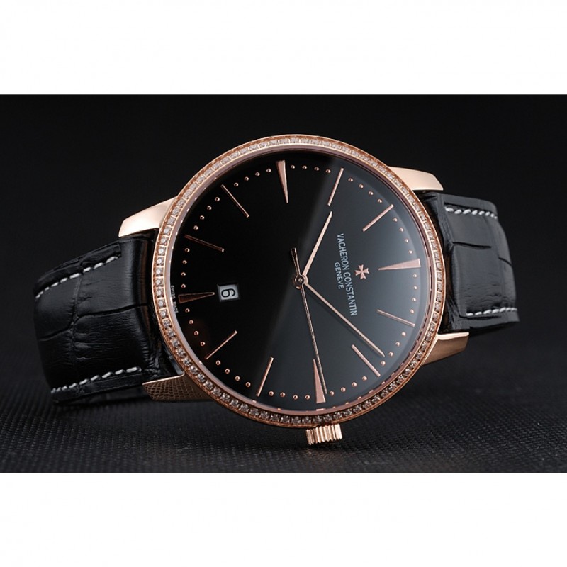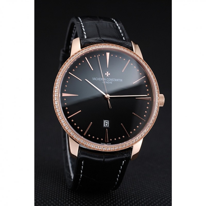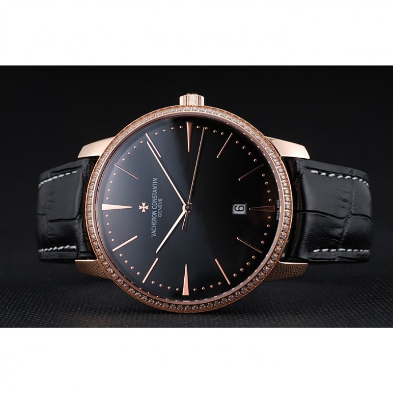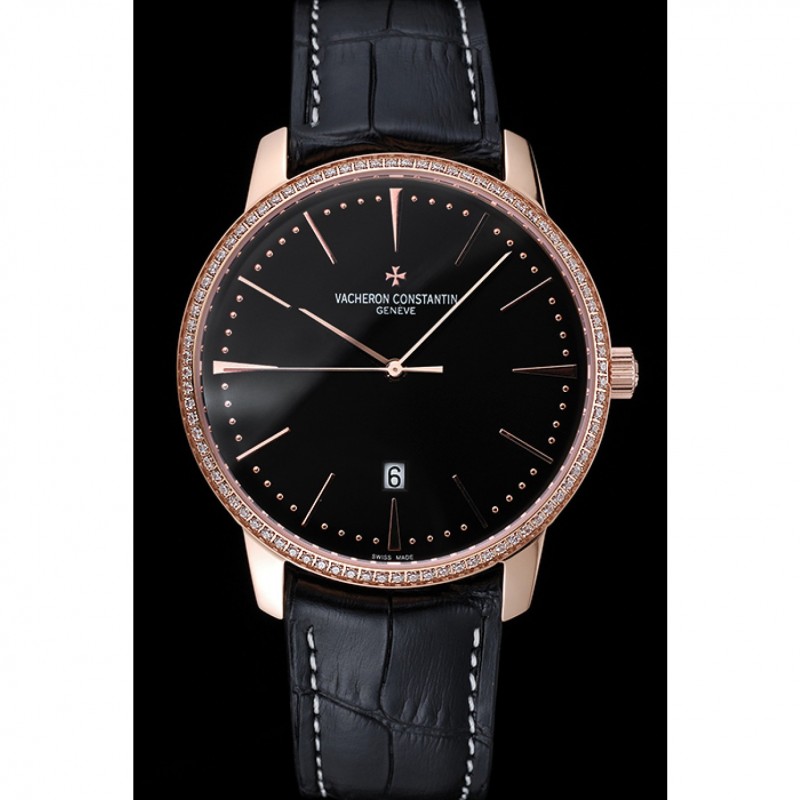 pulsera: Vacheron Constantin y el calor logo correa de piel de cocodrilo negro en relieve con la costura de hilo blanco y logo Vacheron Constantin 18k tallada oro rosa plateado broche de gancho hebilla