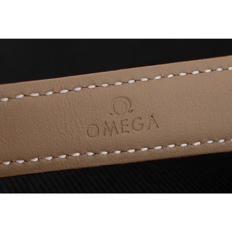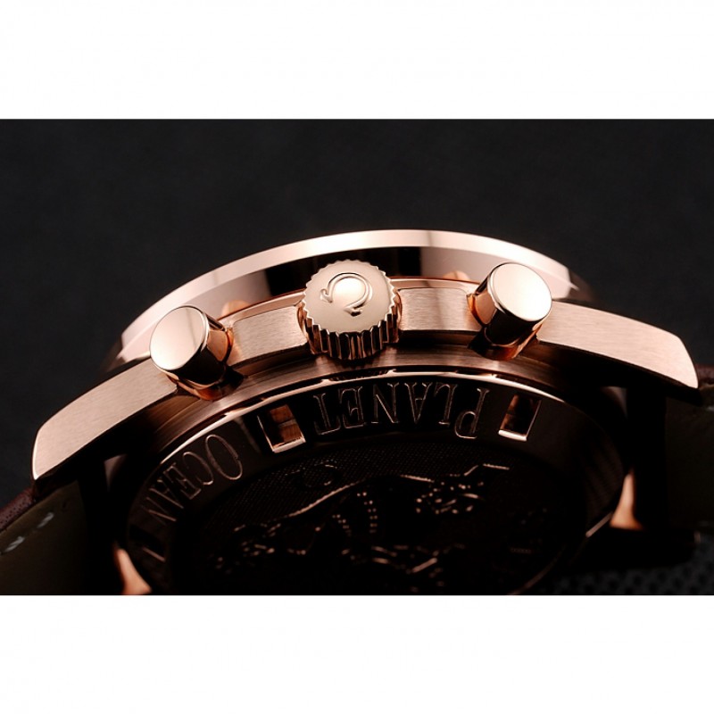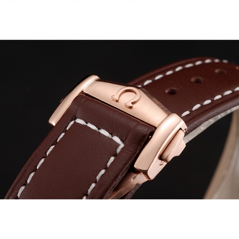 pulsera: logo y correa de cuero Omega calor en relieve marrón con costuras de hilo blanco y Omega logo 18k tallada oro rosa plateado empujar de liberación gancho corchete