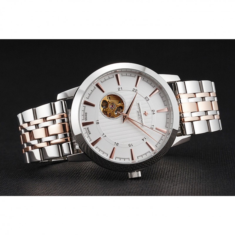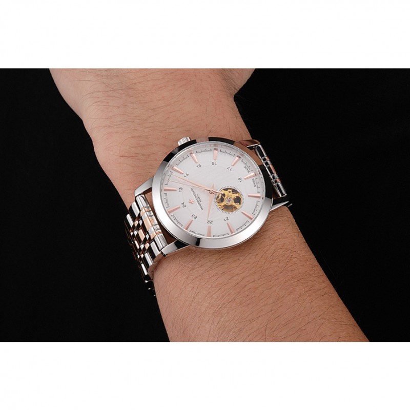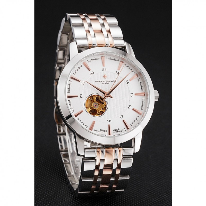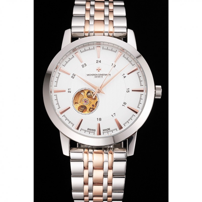 Volver: de acero inoxidable pulido complemento de vuelta con la mecánica transparentes revelando centro y Vacheron Constantin logo grabado